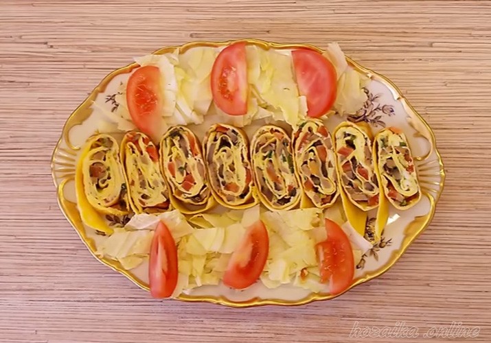 Рулет из омлета с помидорами, грибами и сыром