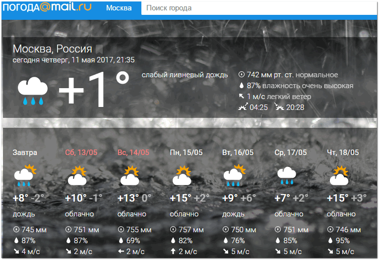 Еще один сервис прогноза погоды от популярного поисковика в Рунете. Перейдя на сайт, Mail.ru автоматически определит ваш город и покажет текущую погоду и прогноз на ближайшие дни. Прогноз представляется в удобной таблички, из которой можно узнать дневную и ночную температуры, осадки, давление, влажность, направление и скорость ветра.