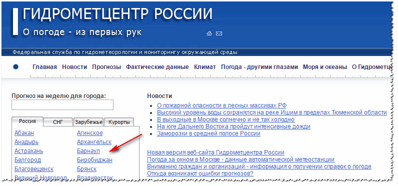 Официальный сайт гидрометцентра России, на котором есть доступ к почти всем городам нашей страны, СНГ, зарубежья, курорты (самые крупные города доступны в колонке слева). Гидрометцентр предсказывает погоду с 1930 года, и как вы понимаете, специалисты с таким огромным опытом - одни из самых точных! Хотя, их сайт и не смотрится самым уж красивым среди других сайтов о погоде, но тем не менее...